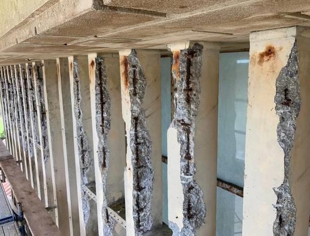 鉄筋コンクリート構造物の補修 =海沿いのコンクリート構造物にて塩分が浸透し、コンクリートが剥落= 場 所 沖縄県ゴルフ場 仕 様 テリフィック GC-100テリフィック GC-110テリフィック GC-13モルタルコスモファインマイルドルーフ S(ダンセイ) 【施工前】 【施工後(5年後)】